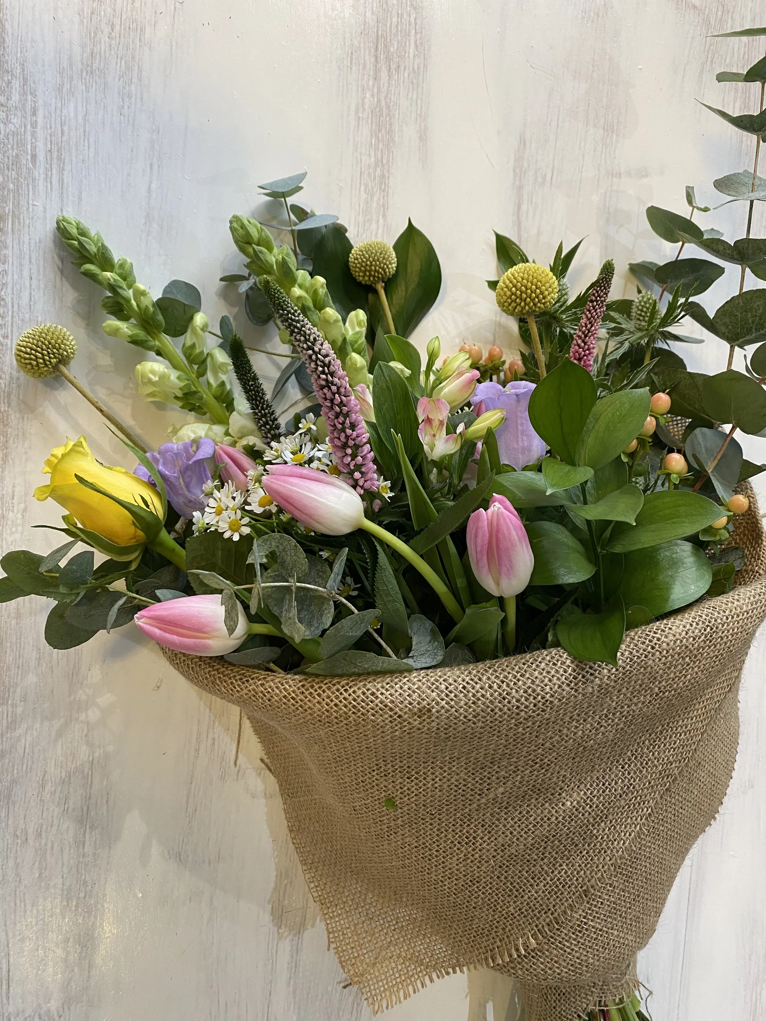 This stunning spring bouquet is completely waste free. The bouquet comes plastic free wrapped in natural hessian and tied with a rustic twine.